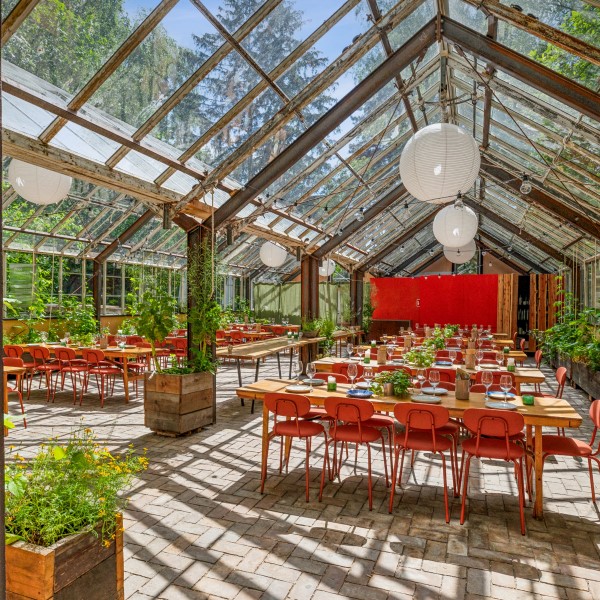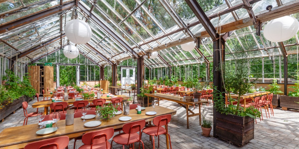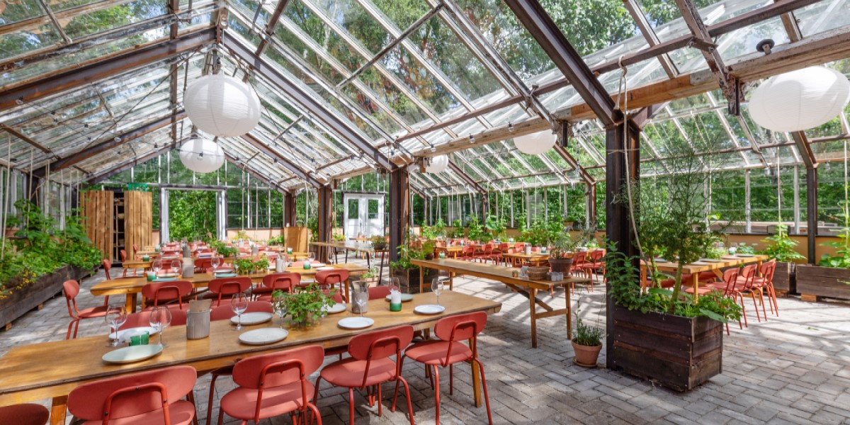 Vores væksthus, som viplamter og blomster op til har fået af Botanisk Have, da de ville skille sig af med det, kan have op til 80 personerved langborde. Væksthuset kan bookes fra 1. maj til 30. september. Her er virkeligt højt til himlen med glastaget og det er omringet af en grøn skov om sommeren, hvor der indenfor vokser planter og blomster op mod tagryggen. Et magisk sted midt i København.
