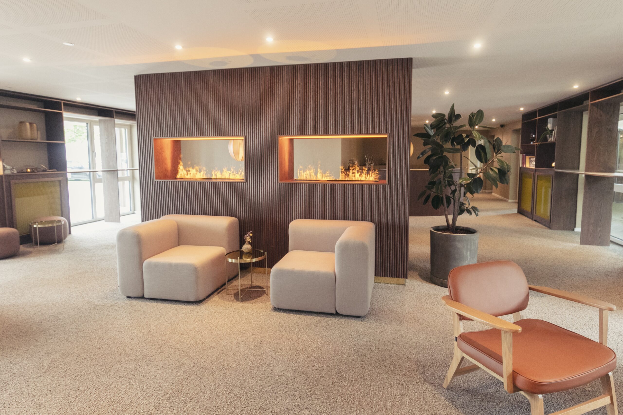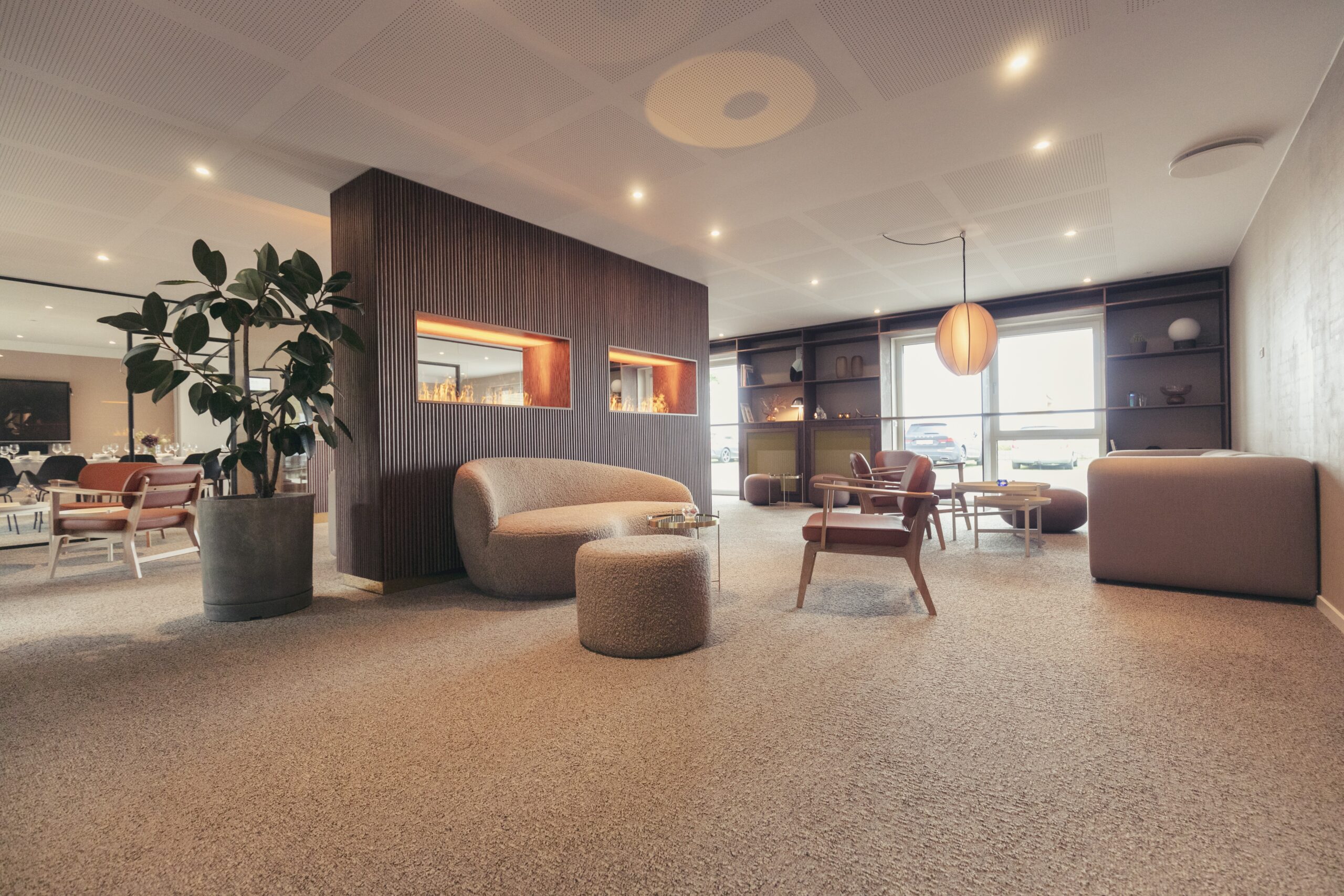 ”I samråd med Fredericia Maskinsnedkeri fik vi tænkt gæsterejsen rigtig godt igennem fra ankomst til afrejse. Receptions og loungeområdet skal være funktionel og samtidig hyggelig. Derudover var det vores ønske, at loungen blev brugt af vores gæster gennem hele dagen, og ikke kun om aftenen. Derfor har vi lavet høje borde til gruppearbejde i vindueshullerne og lavet sofamiljøer, hvor man kan arbejde uforstyrret.”