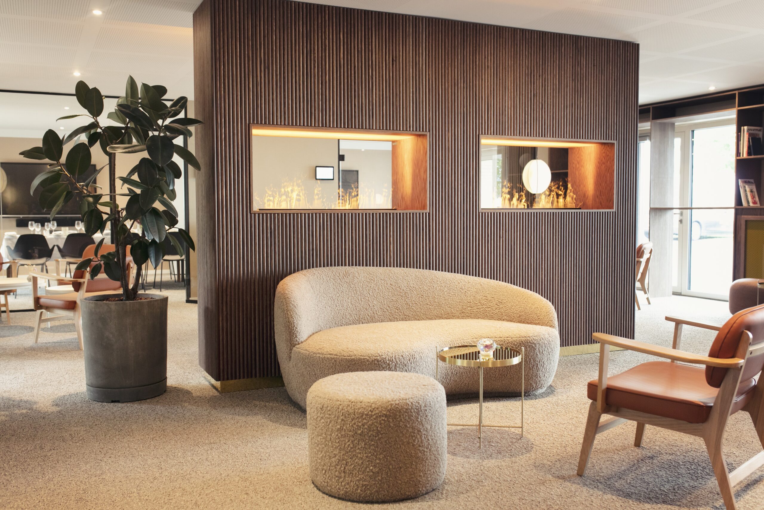 Derudover kan lyset i loungen skifte farve og f.eks. indstilles til virksomheds logo-farver. Pejsen er en hybridpejs, som bruger damp og led-lys til at opnå en meget livagtig effekt.