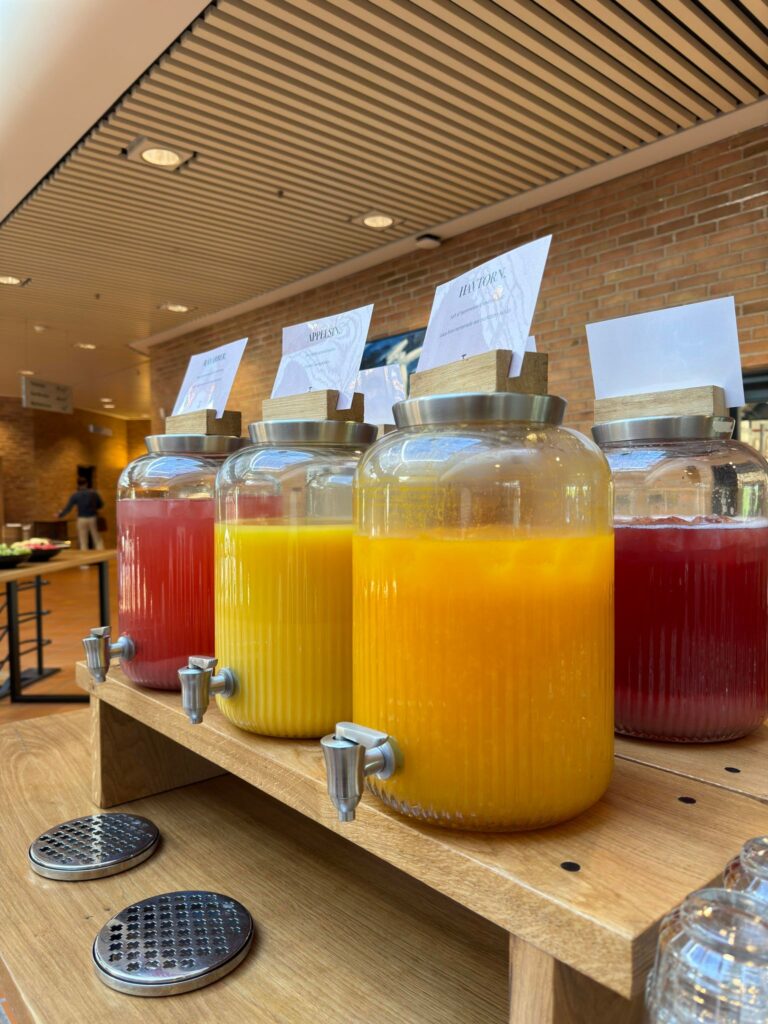 Vi præsenterer vores eksklusive juicebar og kagebuffet – en forfriskende oplevelse, der vil forvandle din mødepause til højdepunktet sidst på dagen.