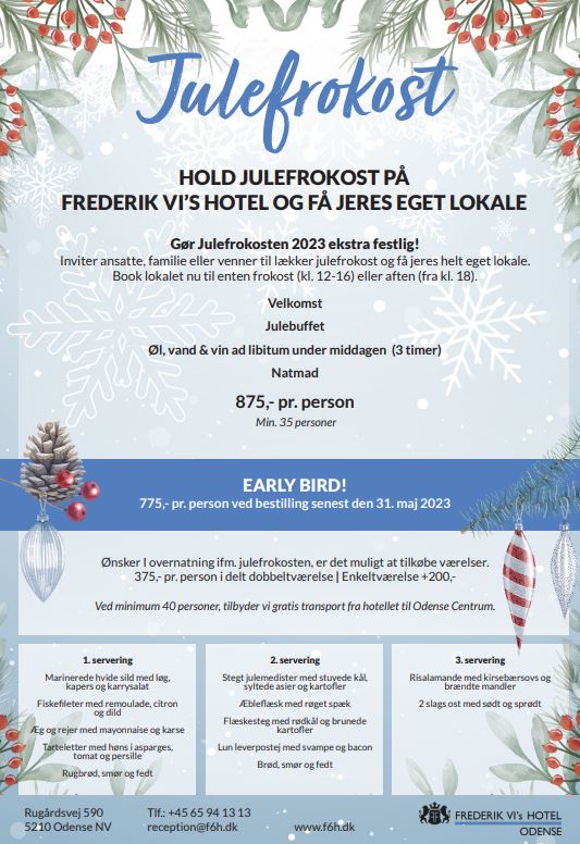 Book jeres julefrokost allerede nu, så du har ro i maven resten af året. Frederik VI´s Hotel i Odense har lige nu et early bird tilbud ved bestilling senest den 31. maj.