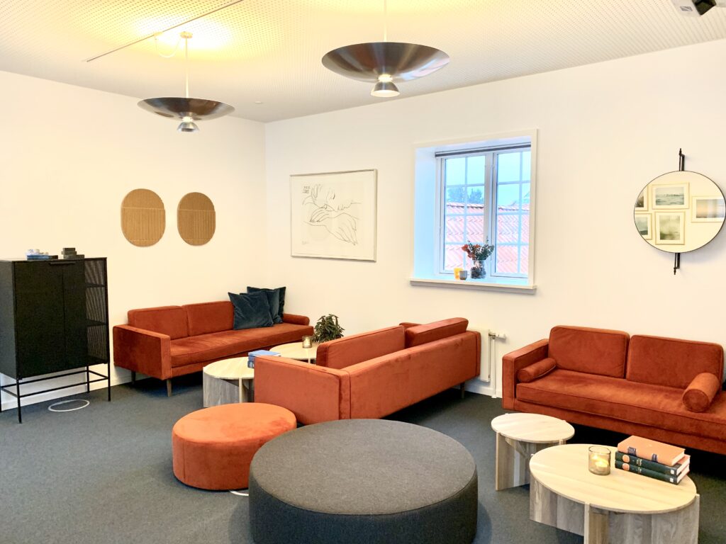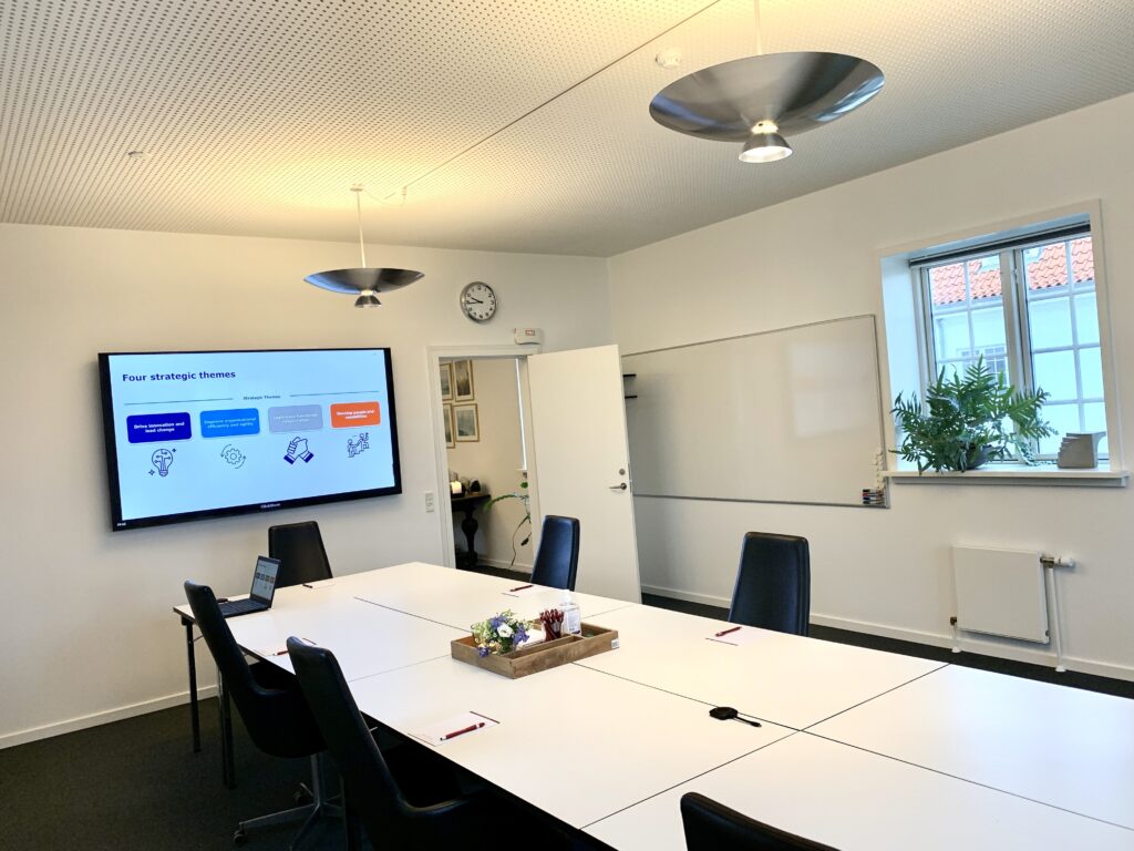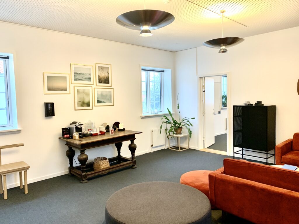 Lokalet er delt op i to rum, hvor du i det første rum har store sofaområder og adgang til egen kaffe/the faciliteter i rolige omgivelser. Rummet er ideelt som Break Out room, til frokost, til samtaler eller blot ekstra plads. I selve mødelokalet er der installeret en stor skærm med mulighed for “click-share”. I alt to store rummelige lokaler til både mødet og pausen med egen kaffemaskine og loungemøbler.