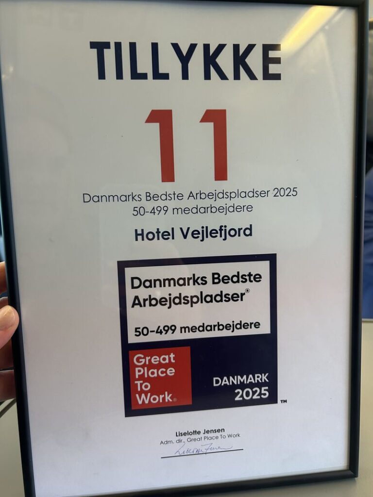 Og succesen stopper ikke der. Hotellet er netop blevet kåret som nummer 11 på listen over Danmarks bedste arbejdspladser i kategorien 50-499 medarbejdere. Derudover er Hotel Vejlefjord også nomineret til specialprisen for mangfoldighed – en ekstra anerkendelse, som hele teamet er meget stolte af.