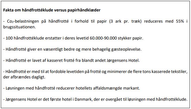 forbedre gæsteoplevelsen markant. Med håndfrottéklude reducerer Jørgensens Hotel deres CO2-belastning betragteligt, uden øgede omkostninger, men samtidig giver de nye klude også gæster en langt mere behagelig og luksuriøs oplevelse, når de benytter toiletfaciliteterne.