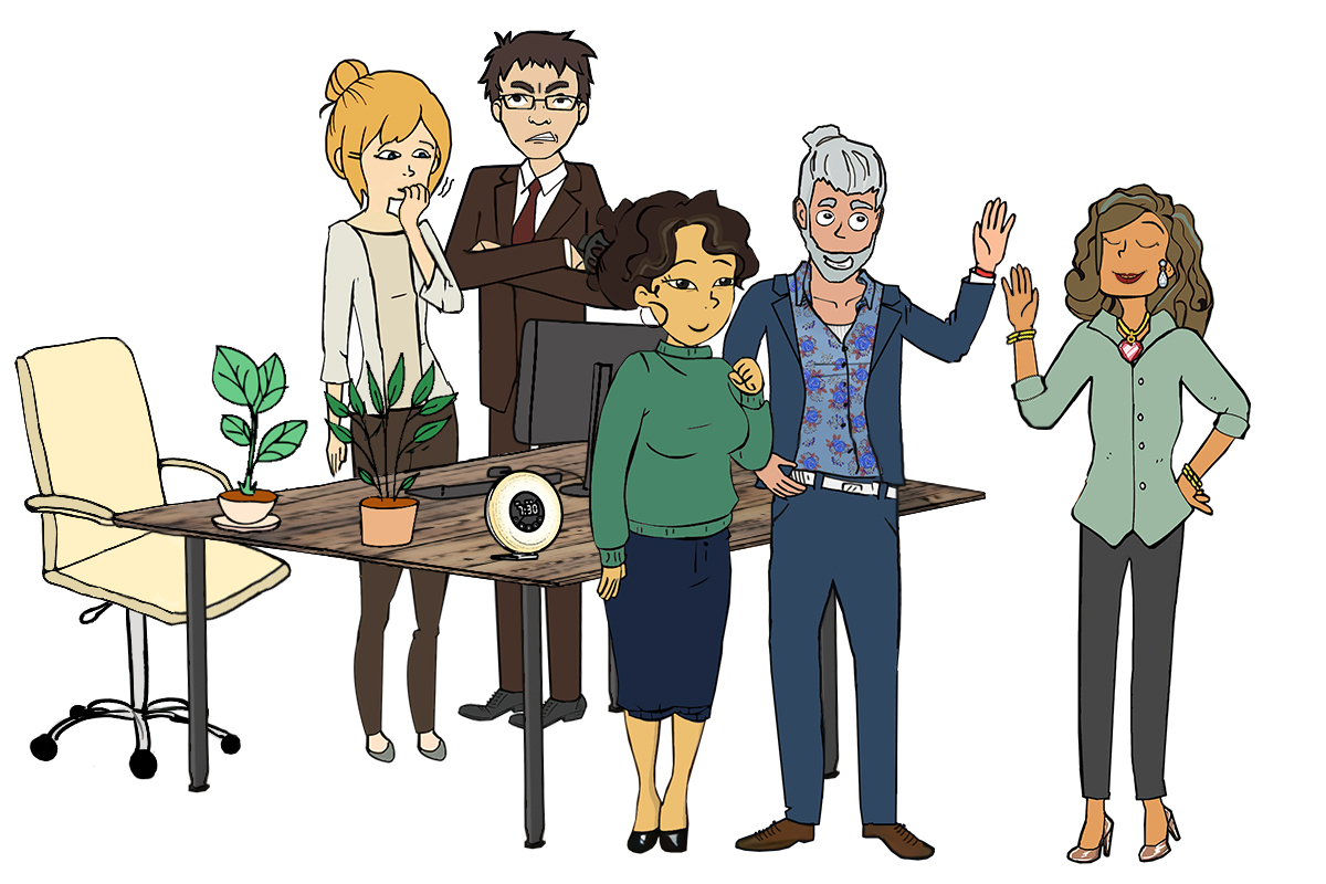 Hvis du synes, at Lars, Niels, Hanne og Sonja virker som nogle meget karikerede typer, så er du ikke helt galt på den. Vi har designet deres karaktertræk ud fra DISC, som er et udbredt værktøj til at forstå mennesker gennem persontyper. Deres efternavne gemmer på et lille hint om, hvilke DISC-profiler de hver især har.