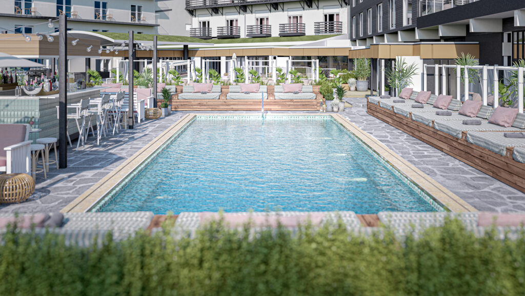 Den kommende poolterrasse vil omfatte en opvarmet pool med en temperatur på 35 grader, der strækker sig over 90 kvm. Gæsterne kan også se frem til at nyde poolens varme med en forfriskning uden at forlade vandet, takket være de integrerede siddebænke i poolen.