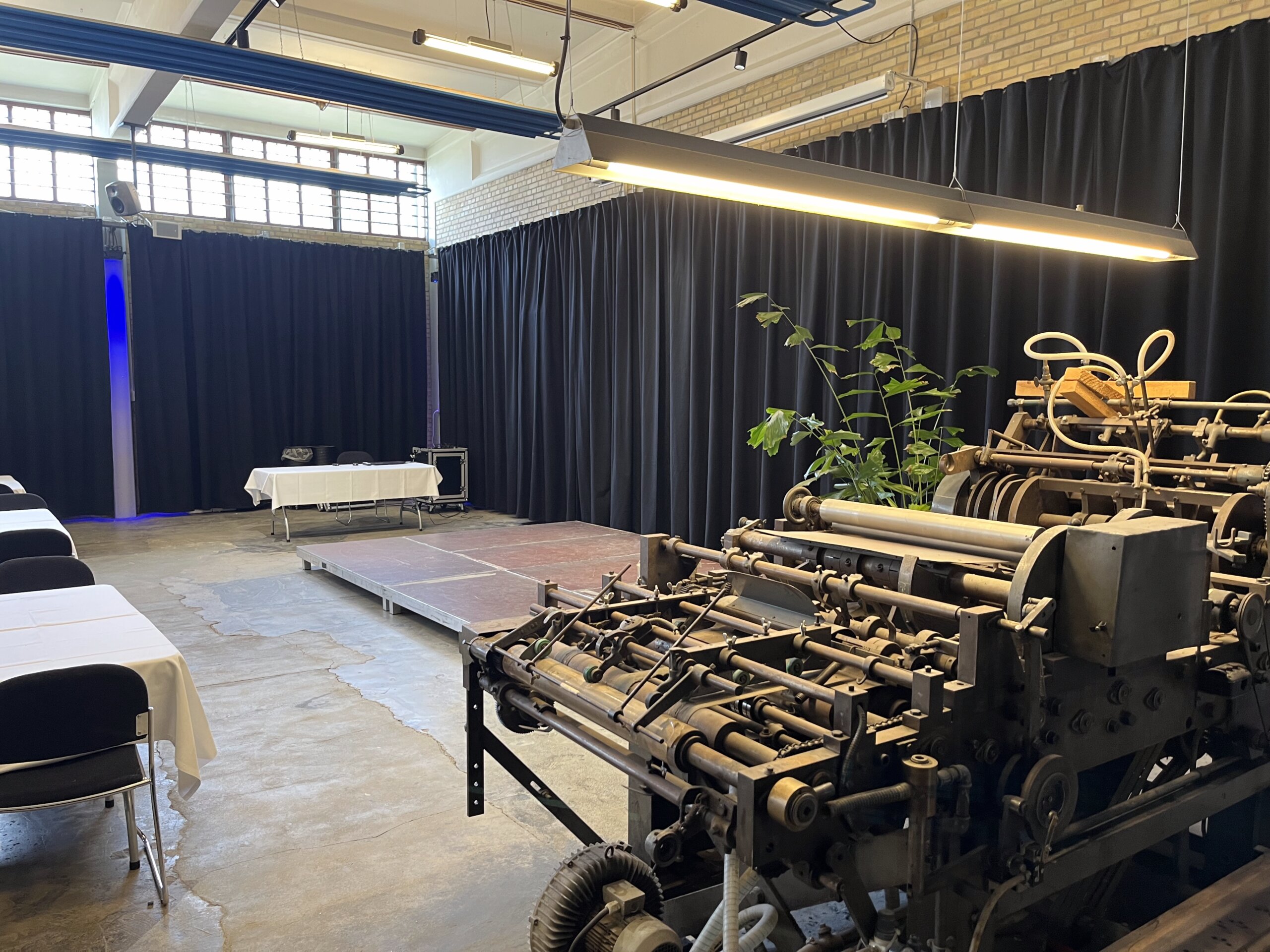 Trykkeriet har fået et kærligt (og velfortjent) løft med bl.a. ny projektor, nye gardiner, nymalede vægge og renoverede toiletter. Alt sammen for at sikre, at rammerne følger med den oplevelse, vi ønsker at give vores gæster: professionel, stemningsfuld og med masser af historisk karakter.