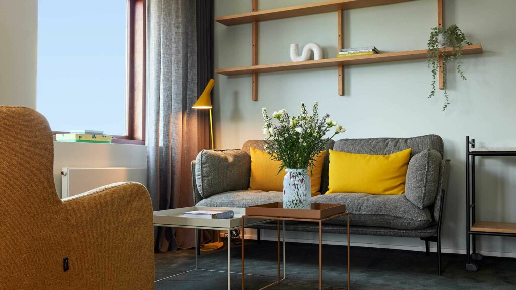 Hver hotellejlighed er møbleret med nøje udvalgt dansk design fra anerkendte producenter som HAY, &tradition, Gubi og Arne Jacobsen. Udover disse fremtrædende brands er der også specialfremstillede elementer, der er skræddersyet til at opfylde hotellets unikke behov.