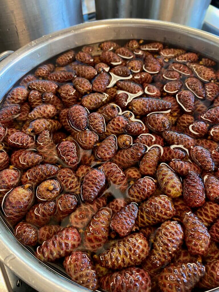 I år har kokkene sanket fyrkogler, som tilfører en diskret, harpiksagtig aroma til udvalgte retter.