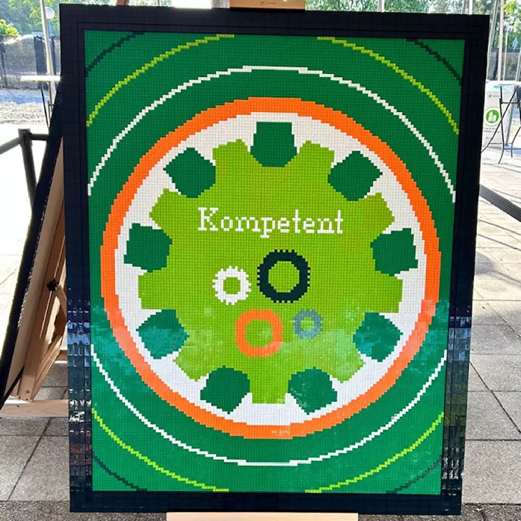 Når alle klodserne er bygget, vil de blive samlet på en ramme, der også er konstrueret af LEGO® klodser. Og så, i et øjeblik af fællesskab og spænding, vil det endelige billede afsløres – en perfekt kulmination på jeres indsats og teamwork.