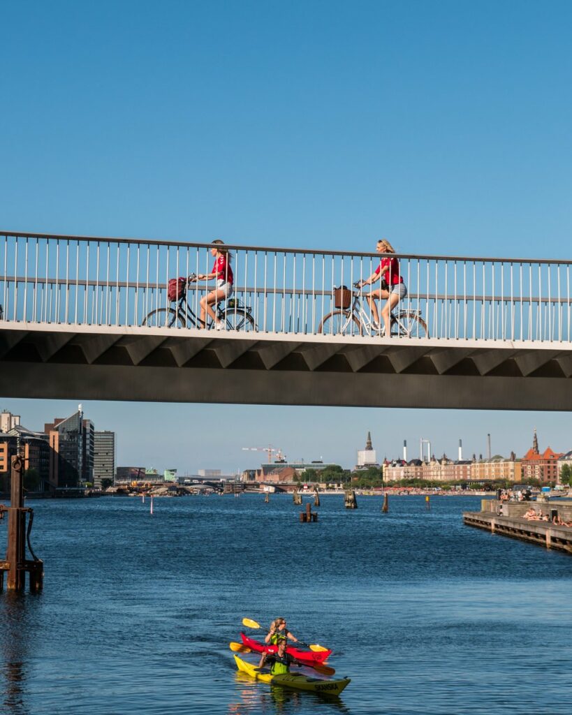 Er I mere til fast grund under fødderne, så anbefaler vi at leje vores hotelcykler og tage turen langs havnefronten på cykel. Dine gæster kan cykle over den ikoniske cykelslange ved Copenhagen Mall over til Islands Brygge, langs vandet og videre til Christianshavn og de smukke huse i mange farver. Her kan I gøre stop ved Vor Frelser Kirke og tage de 400 trin op i tårnet og nyde udsigten over vores hovedstad.