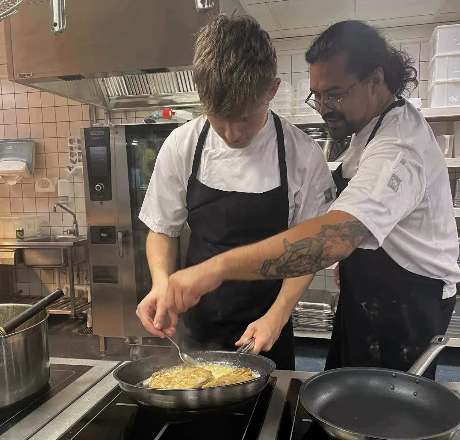 Og vokset med opgaven, det har eleverne i den grad. En af dem er 19-årige Terkel, der er to år inde i sin kokkeuddannelse. Med en afslappet og samtidig selvsikker tone fortæller han om, hvordan eleverne har fået frie hænder til at udforme menuen, og hvordan de har kastet sig ud i opgaven med stor begejstring.