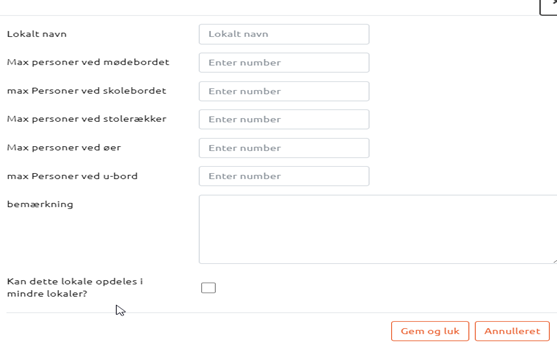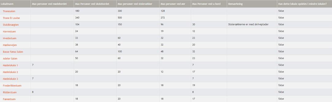 Oplysningerne her vises ikke på hjemmesiden men er meget brugbare for os i bookingprocessen, hvor vi ofte får spørgsmål vedr. muligheden for forskellige opstillinger i lokalerne.