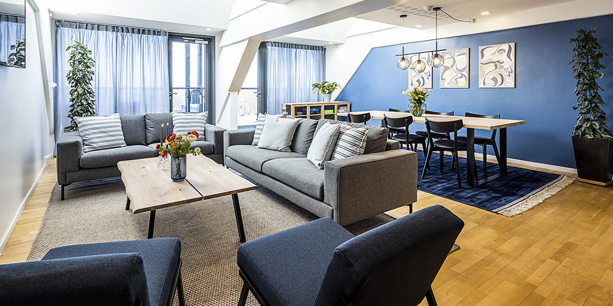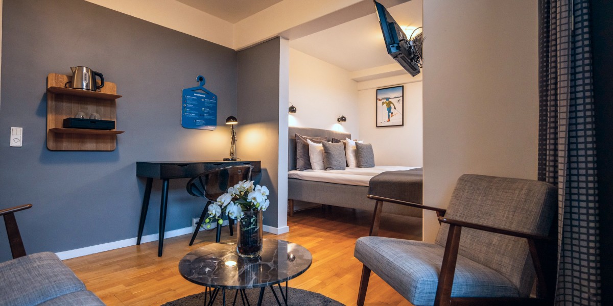 Vi tilbyder også en suite med to værelser, der inkluderer et lille opholdsområde.