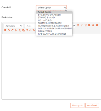 OBS! Alt, du lægger op her, vises på hjemmesiden og skal derfor godkendes af os først. Bookon og hjemmesiden synkroniserer én gang i døgnet, typisk omkring midnat – dine ændringer vil derfor først være synlige den efterfølgende hverdag.