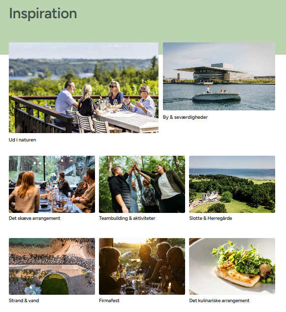 Vores kunder benytter ofte vores hjemmeside DKBS.dk og søgefeltet øverst på siden, hvor de kan søge konkret ift. lokation, antal deltagere, antal værelser osv. Men lige så ofte søger de inspiration vedr. f.eks. teambuilding, naturskønne omgivelser, nærliggende seværdigheder osv. via Inspirationskategorierne længere nede på siden. Vi vil derfor gerne have jeres input til, hvilke af de 8 inspirationskategorier, I gerne vil vises i.
