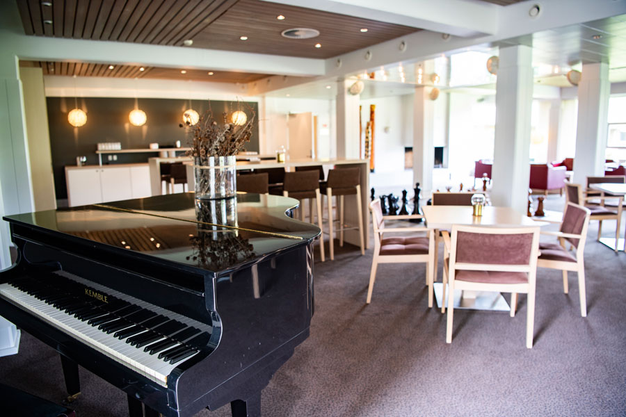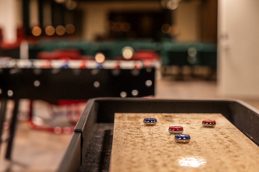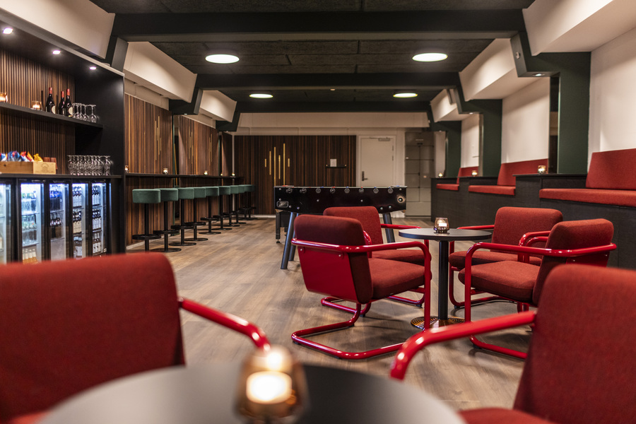 Når stemningen skal have et løft, byder loungebaren på shuffleboard, bordfodbold, en velassorteret bar – og mulighed for at sætte musik på, der kan skabe den rette vibe. Rummet er derfor ideelt både til afslapning og som et naturligt samlingssted for fest og socialt samvær efter en dags intensive møder.