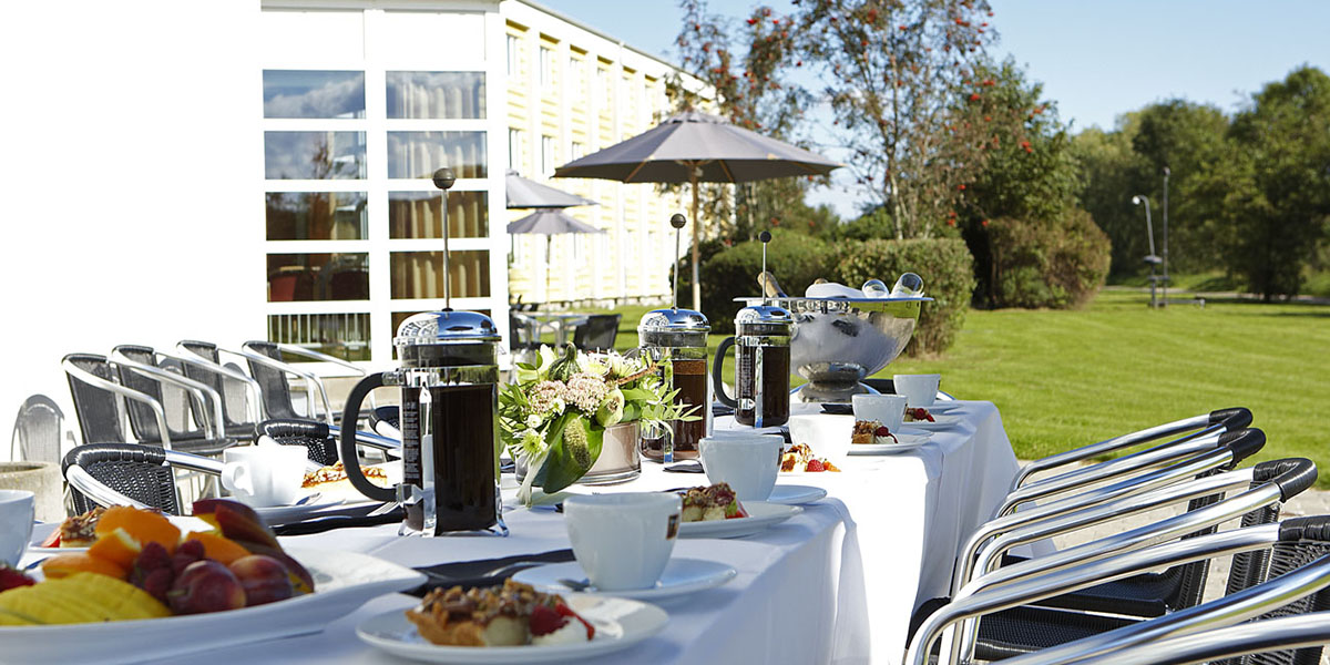 Flere af vores lyse mødelokaler har udgang til en terrasse med udsigt til Vejle Å. Det er derfor det perfekte sted at trække lidt frisk luft i løbet af dagen for at få energi til hjernen og resten af