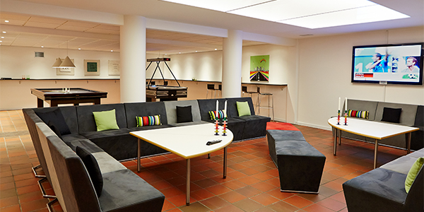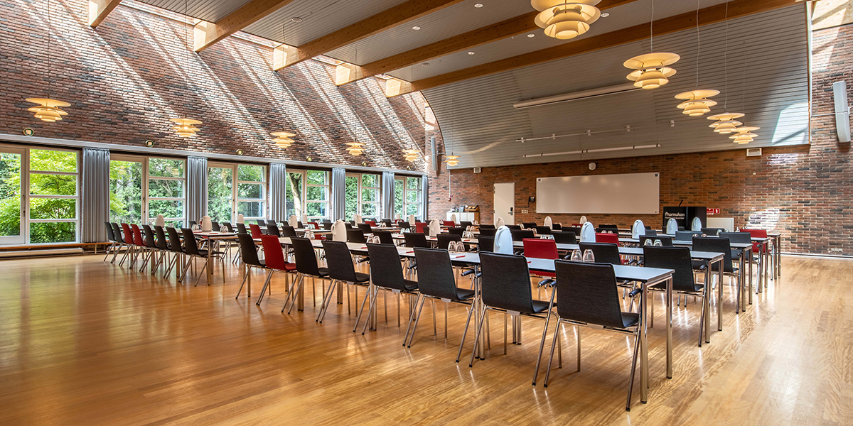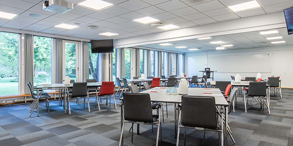 Foredragssal med højt til loftet og plads til 200 personer. 27 lækre undervisningslokaler og møderum. Alle lokaler og møderum har naturligt lysindfald og udsigt til grønne arealer. Herudover flere, inde og ude, lounge- og pauseområder.