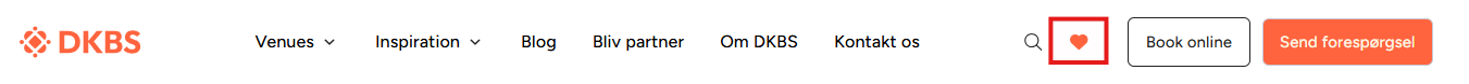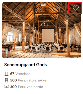 • Klik på ❤️ i topmenuen (dette er din ønskeliste) → tryk Få tilbud → udfyld og send formularen. Nu har du sendt én forespørgsel til dine ønskede venues.